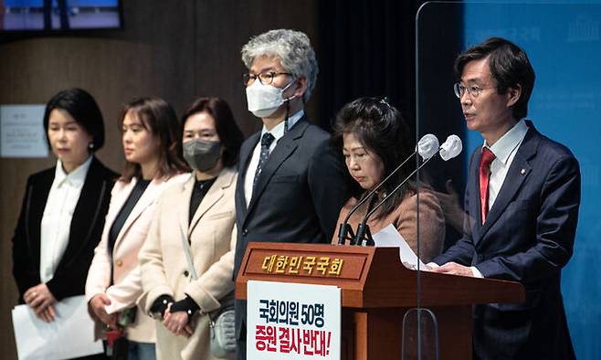 | “의원 숫자 늘리자는 주장은 국민 무시하는 처사” 국민의힘 조경태 의원(오른쪽)이 20일 서울 여의도 국회 소통관에서 기자회견을 열고 정치개혁특별위원회 소위 결의안에 대해 “국회의원 숫자부터 늘리자는 주장은 국민을 무시하는 처사”라고 반대 의견을 밝혔다. 정개특위 소위가 결의안 형식으로 의결한 선거제 개편안 중 2개 안은 비례대표 국회의원 50명 증원을 골자로 한다. 뉴스1 |
