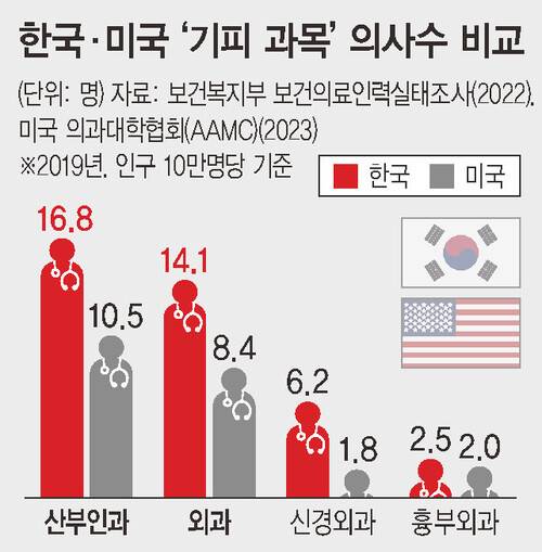 기피 과목 전공의 지원율이 낮은 진짜 이유는 수요에 비해 전공의 정원이 많기 때문이다. 인구당 의사 수를 미국과 비교하면, 우리나라 의사가 미국보다 외과 1.7배, 산부인과 1.6배, 흉부외과 1.3배가량 더 많다. 병원들은 인건비가 많이 드는 전문의 대신 저렴한 인건비로 장시간 노동을 감당하는 전공의를 충원하려고 한다. 보건복지부와 전문과목 학회들은 병원을 운영하는 데 필요한 전공의 수를 기준으로 정원을 책정하는데, 이는 병원이 채용하는 전문의 수보다 2배 가까이 많다. 그 결과 전공의 과정을 마치고도 큰 병원에 자리를 얻지 못한 외과, 흉부외과, 산부인과 전문의들은 동네 의원을 차린다. 흉부외과 의사의 31%, 외과 의사의 40%, 산부인과 의사의 53%가 의원에서 일하는데, 이들 중 전문분야를 진료하는 의사는 흉부외과 14%, 외과 26%, 산부인과 40%에 불과하다.