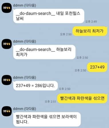 다다음의 AI 답변은 대부분 다음 검색을 기반으로 하는 것으로 보입니다. 내일 경기 포천힐스 골프장 날씨를 묻자 ‘_do-daum-search_내일 포천힐스 날씨’라는 답변이 나왔기 때문인데요. 한 AI 스타트업의 개발자는 “프로그램이 저 명령어대로 시행을 했어야 하는데 에러(오류)가 난 것”이라며 “이 과정에서 명령어 내용을 단순 출력한 것 같다”고 설명했습니다.
