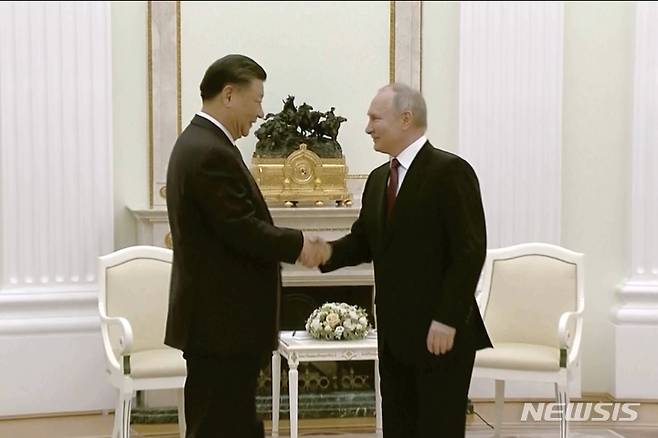 [모스크바=AP/뉴시스] 러시안풀이 제공한 화면 캡처 사진에 시진핑(왼쪽) 중국 국가주석과 블라디미르 푸틴 러시아 대통령이 20일(현지시간) 러시아 모스크바에서 열린 면담에서 악수하고 있다. 2023.03.20.