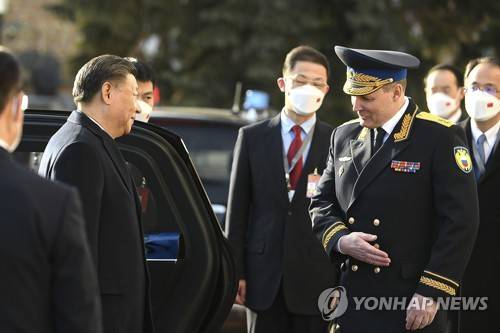 In this handout photo released by Russian Presidential Press Office, Chinese President Xi Jinping, left, is welcomed by Commandant of the Moscow Kremlin Sergei Udovenko as he arrives for the meeting with Russian President Vladimir Putin at the Kremlin in Moscow, Russia, Monday, March 20, 2023. (Russian Presidential Press Office via AP) AP PROVIDES ACCESS TO THIS PUBLICLY DISTRIBUTED HANDOUT PHOTO PROVIDED BY RUSSIAN PRESIDENTIAL PRESS OFFICE ; MANDATORY CREDIT.