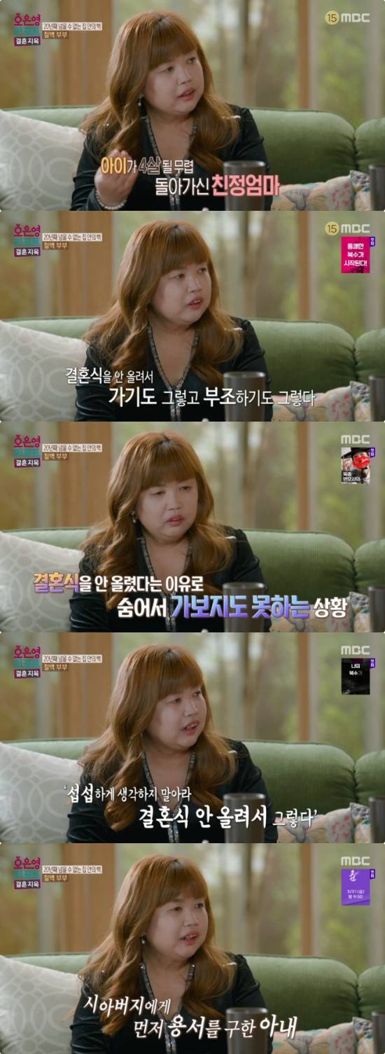 (엑스포츠뉴스 이이진 기자) 철벽 부부가 결혼식을 올리지 않았다는 이유로 시댁 식구들에게 인정받지 못한 사연을 털어놨다.
