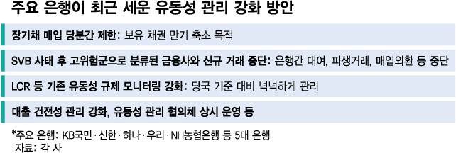 미국 실리콘밸리은행(SVB) 파산을 계기로 국내 주요 은행들이 선제적으로 유동성 관리를 강화했다. 만기가 긴 채권을 매입하지 않거나 기존 유동성 규제 관련 지표를 금융당국 기준보다 여유있게 관리하는 등 방식이다.