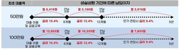 50만원을 빌리면 최초 월 이자부담은 6416원(15.4% 기준)으로 이자를 성실 납부하면 6개월 후 5166원, 추가 6개월 후 3916원까지 금리부담이 낮아진다. 최초 100만원을 대출 받으면 첫 이자부담은 1만2833원이고, 성실 상환하면 최종 이자 부담은 7833원으로 줄어든다.