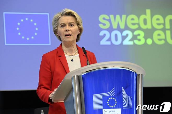 (AFP=뉴스1) 김민수 기자 = 우르줄라 폰데어라이엔 유럽연합(EU) 집행위원장이 20일(현지시간) 지진 피해를 입은 튀르키예와 시리아 관련 문제를 논의하는 회의에서 연설하고 있다.