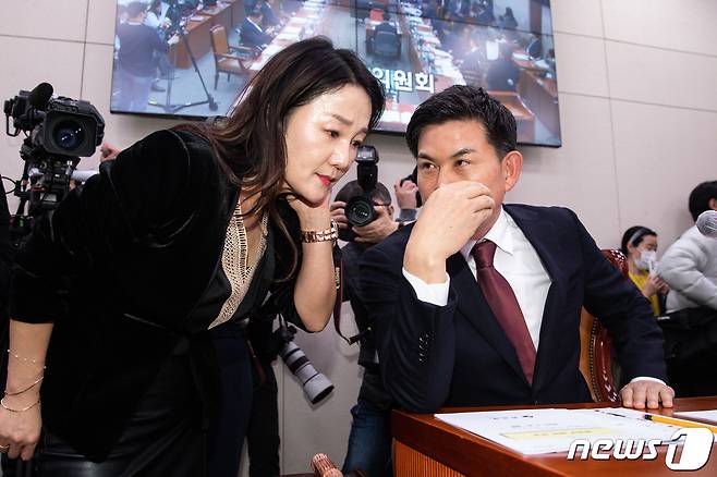 (서울=뉴스1) 유승관 기자 = 김태호 국회 외교통일위원장(오른쪽)과 이재정 더불어민주당 간사가 21일 서울 여의도 국회에서 열린 제404회 국회(임시회) 외교통일위원회 제2차 전체회의에서 차수 논란과 관련 정회 후 대화를 나누고 있다. 국민의힘은 지난 13일 야당 단독으로 전체회의를 열고 일제 강제동원 결의안을 의결한 것은 원천 무효라며 이날 회의가 1차 회의라 주장했고, 더불어민주당은 국회법에 따라 적법한 절차로 이뤄진 회의라며 이날 회의가 2차 회의라고 반박했다. 2023.3.21/뉴스1