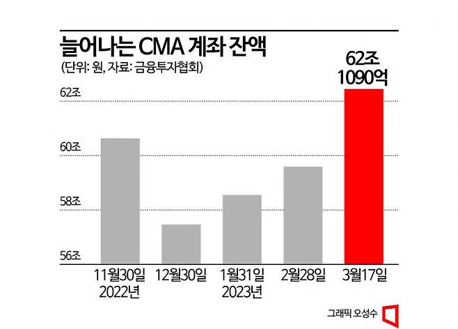 21일 금융투자협회에 따르면 가장 최신 자료인 이달 17일 기준 CMA 잔고는 62조1090억원으로 집계됐다. 지난해 말까지만 해도 잔고는 57조5036억원에 머물렀지만 이후 매달 꾸준히 늘었다. 지난달 27일과 이달 7일에는 잔고 액수가 각각 60조원, 61조원을 넘어섰다.