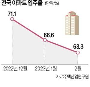 21일 주택산업연구원에 따르면 올해 2월 전국 아파트 입주율은 63.3%로 전달(66.6%) 대비 3.3%포인트 떨어졌다.