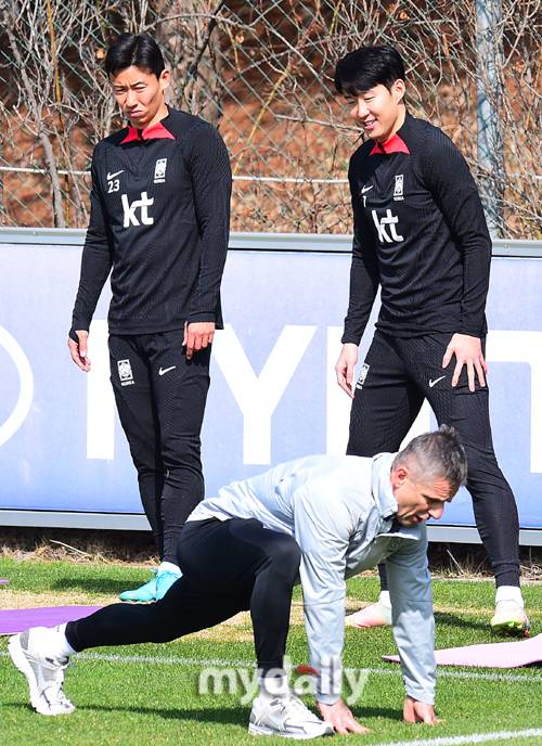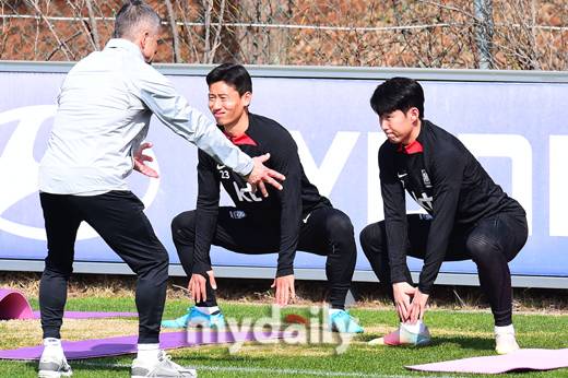 [김태환과 손흥민이 엉거 주춤한 자세로 스트레칭을 하고 있다. 사진 = 곽경훈 기자 kphoto@mydaily.co.kr]
