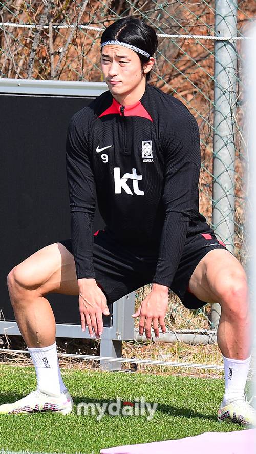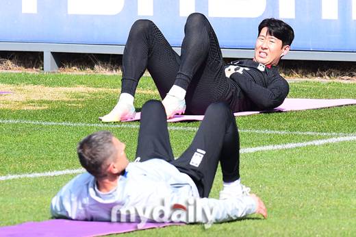 처음에는 가벼운 스트레칭을 하면서 몸의 근육을 풀어주었고, 시간이 지나면서 강도가 높아졌다. 손흥민과 김태환은 인상을 쓰면서 스트레칭을 했고, 조규성이 강한 인상을 쓰면서 스트레칭의 강도를 높였다.