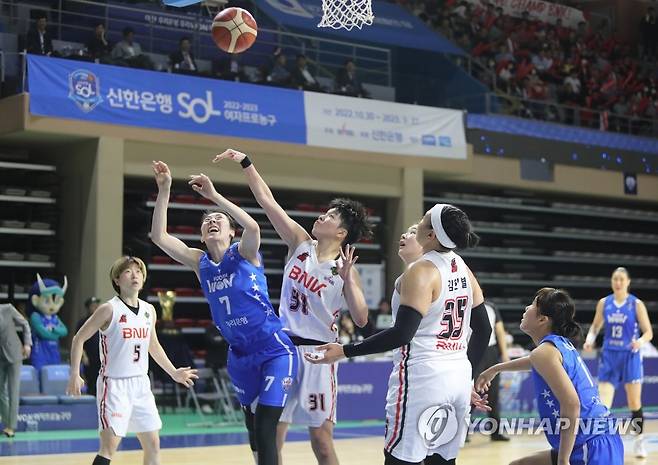 (아산=연합뉴스) 이주형 기자 = 21일 충남 아산 이순신체육관에서 열린 여자농구 챔피언 결정전 2차전 우리은행과 BNK의 경기. BNK 진안이 우리은행 박혜진의 공격을 막고 있다. 2023.3.21