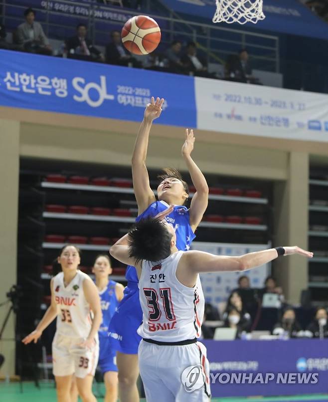 (아산=연합뉴스) 이주형 기자 = 21일 충남 아산 이순신체육관에서 열린 여자농구 챔피언 결정전 2차전 우리은행과 BNK의 경기. 우리은행 박지현이 BNK 진안의 수비를 피해 득점하고 있다. 2023.3.21