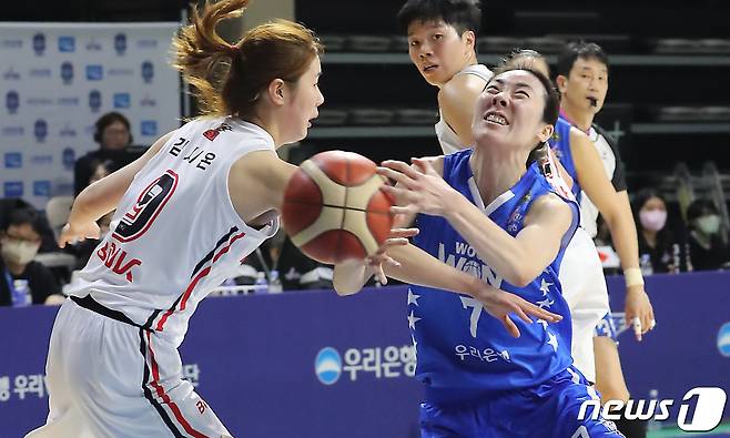 (아산=뉴스1) 김기남 기자 = 21일 충남 아산 이순신체육관에서 열린 여자농구 챔피언결정전 2차전 우리은행과 BNK의 경기에서 우리은행 박혜진이 BNK 김시온의 수비에 막히며 공을 놓치고 있다. 2023.3.21/뉴스1