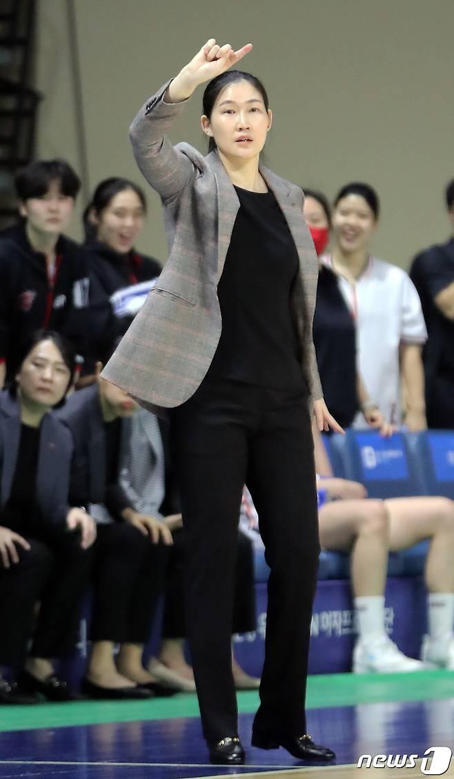 (아산=뉴스1) 김기남 기자 = 21일 충남 아산 이순신체육관에서 열린 여자농구 챔피언결정전 2차전 우리은행과 BNK의 경기에서 BNK 박정은 감독이 작전 지시를 하고 있다. 2023.3.21/뉴스1