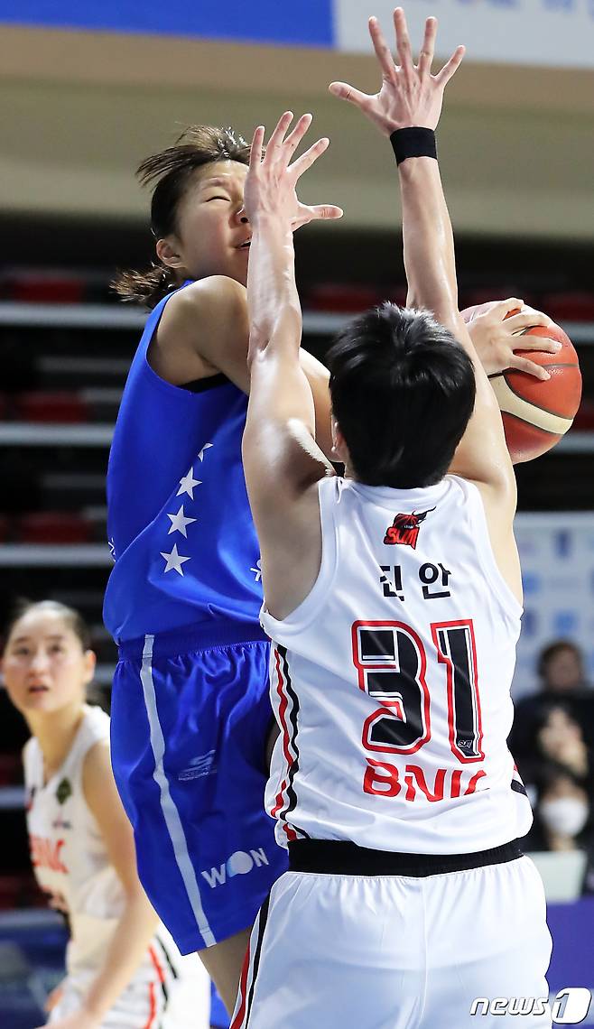 (아산=뉴스1) 김기남 기자 = 21일 충남 아산 이순신체육관에서 열린 여자농구 챔피언결정전 2차전 우리은행과 BNK의 경기에서 우리은행 박지현의 공격을 BNK 진안이 수비하고 있다. 2023.3.21/뉴스1