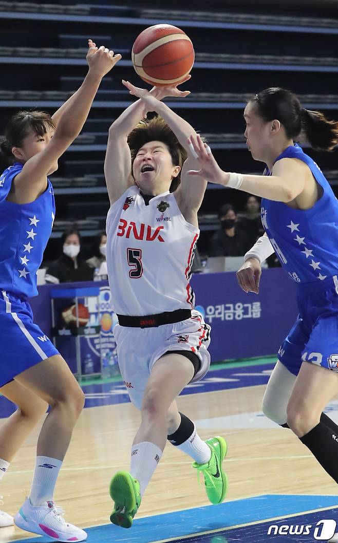 (아산=뉴스1) 김기남 기자 = 21일 충남 아산 이순신체육관에서 열린 여자농구 챔피언결정전 2차전 우리은행과 BNK의 경기에서 BNK 안혜지가 우리은행 김정은과 박지현 수비를 돌파하며 공격하고 있다. 2023.3.21/뉴스1
