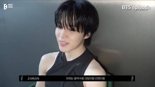 지민은 "어제는 칼국수랑 대창이랑 라면이랑, 좀 매운 게 먹고 싶기도 하고. 떡볶이도 제가 안 먹은지 진짜 오래됐다. 되게 맛있는 김치랑 칼국수랑 먹으면 맛있을 것 같다"고 먹고 싶은 메뉴들을 나열하며 아련한 표정을 지어보였다.