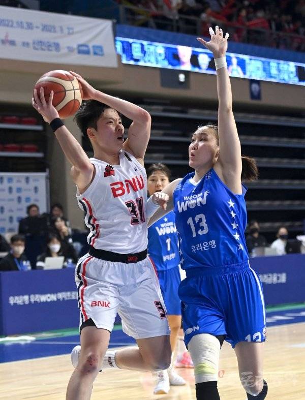 21일 아산이순신체육관에서 열린 ‘신한은행 SOL 2022~2023 여자프로농구‘ 챔피언결정전 2차전 우리은행과 BNK 썸 경기에서 BNK 진안이 우리은행 김정은의 수비를 뚫고 골밑을 공격하고 있다.