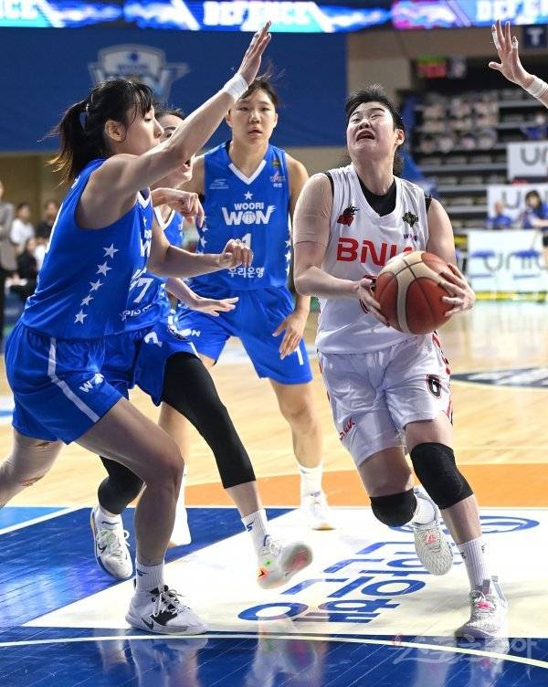 21일 아산이순신체육관에서 열린 ‘신한은행 SOL 2022~2023 여자프로농구‘ 챔피언결정전 2차전 우리은행과 BNK 썸 경기에서 BNK 이소희가 우리은행의 수비를 뚫고 골밑을 공격하고 있다.