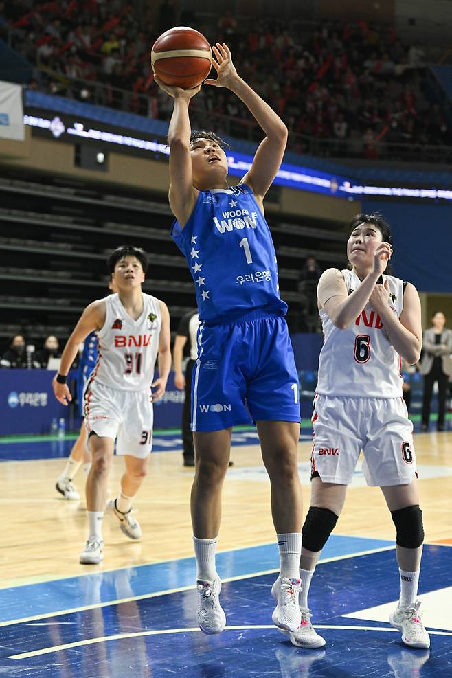 [서울=뉴시스] 고승민 기자 = 21일 아산이순신체육관에서 열린 2022-2023 여자프로농구 챔피언결정전 2차전 우리은행 대 BNK썸 경기, 우리은행 김단비가 골밑슛을 하고 있다. (사진=WKBL 제공) 2023.03.21. photo@newsis.com *재판매 및 DB 금지