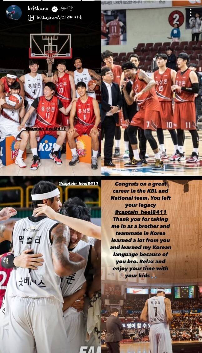 맥컬러는 양희종을 향해 “KBL, 국가대표팀에서 훌륭한 커리어를 쌓았다. 한국에서 뛸 때 나를 형제이자 동료로 받아줘서 고마웠다. 브로 덕분에 많이 배울 수 있었다. 앞으로 아이들과 즐거운 시간을 보내길 바란다”라고 말했다.