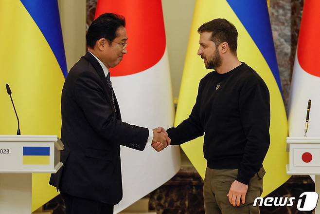 (키이우 로이터=뉴스1) 정윤미 기자 = 21일(현지시간) 우크라이나 수도 키이우를 방문한 기시다 후미오(왼쪽) 일본 총리가 볼로디미르 젤렌스키 우크라이나 대통령과 만나 악수를 하고 있다. 2023.3.21