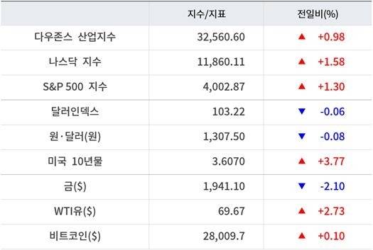 ■기술주 기술주가 큰 폭으로 올랐다. 애플 1.19%, 마이크로소프트 0.57%, 아마존 2.97%, 알파벳 4.62%, 메타 2.20% 상승 마감했다. 구글은 이날 미국과 영국에서 일부 이용자를 대상으로 대화형 인공지능(AI) 바드(Bard)를 공식 출시했다.