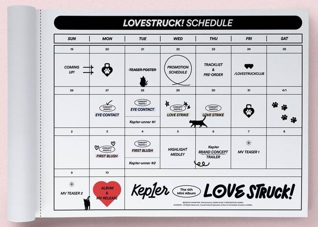 케플러는 3월 22일 0시 공식 SNS를 통해 4월 10일 발매되는 미니 4집 앨범 'LOVESTRUCK!'(러브스트럭) 프로모션 캘린더를 선보였다.