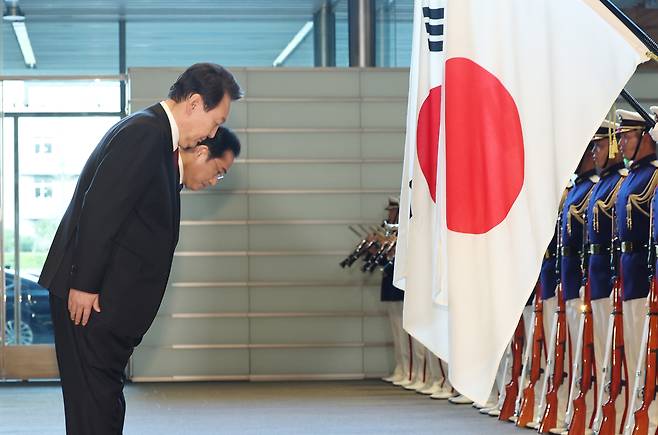 | ▲ 1박2일 일정으로 일본을 방문한 윤석열 대통령이 16일 오후 일본 도쿄 총리 관저에서 기시다 후미오 총리와 의장대 사열에 앞서 양국 국기에 예를 갖추고 있다. |