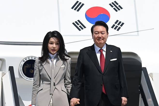 | ▲ 1박2일 일정으로 일본을 방문한 윤석열 대통령과 김건희 여사가 16일 일본 도쿄 하네다공항에 도착, 공군1호기에서 내리고 있다. |