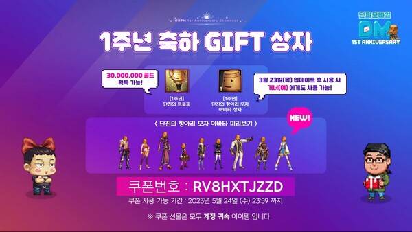 두 번째 상자에는 3000만 골드를 얻을 수 있는 '단진의 트로피'와 단진의 항아리 모자 아바타가 담겨 있다. 단진의 항아리 모자 아바타는 거너(여)도 착용 가능하다. 쿠폰 번호는 'RV8HXTJZZD'다.