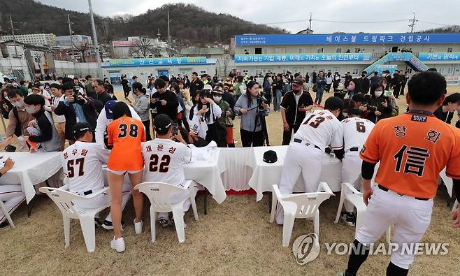 (대전=연합뉴스) 김준범 기자 = 22일 오후 대전시 중구 부사동 한밭운동장 내 새 야구장 부지에서 열린 베이스볼 드림파크 기공식 시작 전 한화이글스 선수들이 사인회를 열고 있다. 2023.3.22