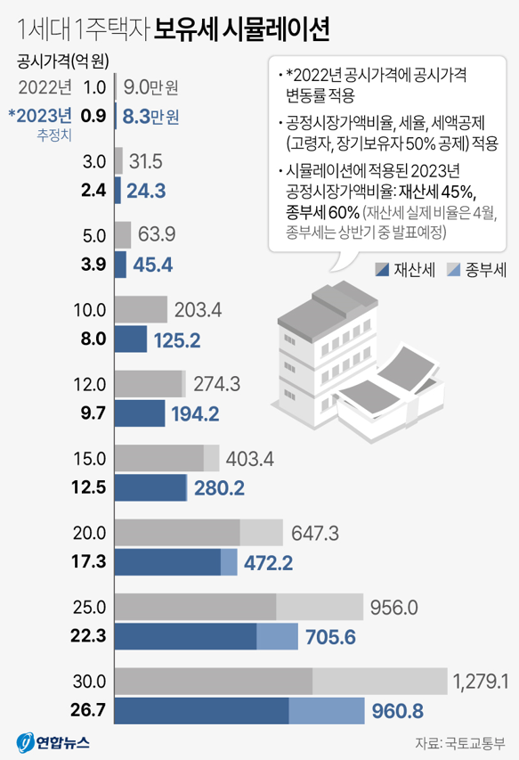 정확한 세 부담 변화를 따져보려면 공정시장가액비율과 공제금액, 세율 등이 확정돼야 하니까 위의 계산이 실제 세금과 차이가 날 수 있습니다. 특히 지난해 정부가 재산세 공정시장가액비율을 60%에서 45%로, 종부세는 95%에서 60%로 낮췄는데 이게 올해는 조정될 수 있습니다.