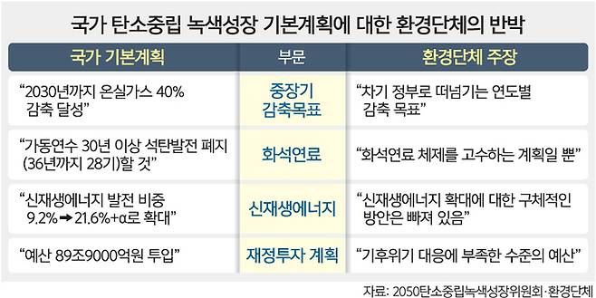 윤석열정부의 첫 탄소중립 기본계획에 대해 기후·환경단체들이 "산업계 부담을 줄이기 위해 정부가 기후위기 대응을 포기했다"며 거세게 반발했다.