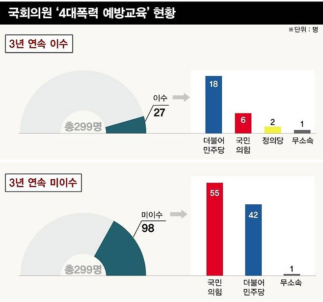 반면 3년 동안 예방교육을 모두 이수한 의원은 27명(9.03%)에 불과했다. 정당별로 보면, 민주당 의원이 18명, 국민의힘 6명, 정의당 2명, 무소속 1명이었다.