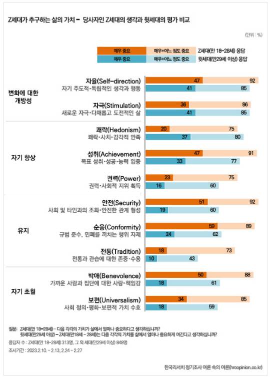 Z세대는 모든 삶의 가치를 모두 골고루 중요하다고 생각하며, 특히 ‘안전’과 ‘순응’에 대해서는 다른 가치들보다도 ‘매우 중요하다’는 인식이 특히 높은 편이다. 반면 윗세대는 Z세대가 ‘변화에 대한 개방성’ 가치들을 가장 중요하게 생각하는 반면, ‘유지’ 나 ‘자기 초월’ 가치에 대해서는 상대적으로 덜 중요하게 생각한다는 인식을 갖고 있다. 한국리서치는 "Z세대가 타인에 대한 배려나 규범 준수, 정서적 유대감보다는 자극적인 목표, 쾌락 등을 훨씬 더 중요하게 생각한다는 오해가 반영된 평가"라고 설명했다.