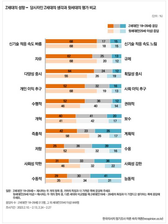 Z세대는 지난달 10일 ∼ 13일, 24일 ~ 27일 진행됐고, 만 29세 이상은 10일 ∼ 13일 실시했다. 95% 신뢰수준에 각 조사별 표집오차는 Z세대(만 18 ~ 28세) ±5.5%포인트, 기타 세대(만 29세 이상) ±3.4%포인트다.