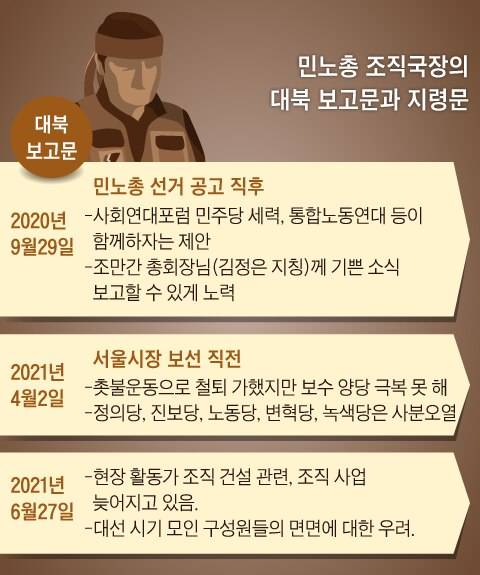 A씨는 2020년 9월 29일 대북 보고문에서 “산별 모임에 사회연대포럼 민주당 세력과 통합노동연대 B씨 등 일부 중앙파(민주노총 내부 강경파)와 현장실천연대가 함께하자는 제안이 들어오고 있다”고 했다. A씨는 자신을 ‘지사장’으로 북한의 김정은을 ‘총회장님’으로 지칭하면서 “조만간 기쁜 소식을 총회장님께 보고드릴 수 있도록 노력하겠다”고 했다. 그는 보고문에서 “지사장(A씨)의 판단은 선거도 중요하지만 철저히 총회장님이 제시하신 회사 활성화와 진보 정당 재편 방향에서 선거를 치를 계획”이라고 했다. A씨가 대북 보고문을 보낸 날은 민주노총이 위원장 공식 선거 일정을 공고한 직후였다. 민주노총은 당시 민주노총과 지역본부 임원 동시 선거를 치렀고 그해 12월 양경수 현 위원장 지도부가 당선됐다. 양 위원장은 이석기 전 통합진보당 의원과 같은 ‘경기동부연합’ 출신이자 대학 동문이다. 당시 민노총 선거에는 총 4개팀이 출마했는데 A씨가 함께하자는 제안이 들어왔다고 북에 보고한 중앙파는 후보를 내지 않았다.