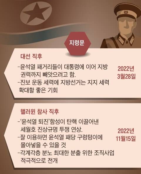 북한은 A씨에게 이태원 참사 이후뿐만 아니라 지방선거와 대선 등 국내 주요 정치 일정을 앞두고 진보 세력의 영향력을 확대하라는 취지의 지령을 내렸다. 지난해 3월 대선 직후 북이 보낸 지령문에는 “(진보 운동 세력이) 각 지역에서 지지 세력을 확대해나갈 수 있는 기회”라고 적시되어 있다. 지령문은 당시 남한 정세에 대해 “현재 윤석열 패거리들이 대통령 자리를 차지한 데 이어 민주당 수중에 장악되어 있는 80%의 지방 권력까지 빼앗아 보수 정치 실현에 유리한 정치 구도 구축 목적 아래 필사적으로 발악하고 있다”고 했다. 그러면서 기존 정치권에 대한 민심이 좋지 않은 분위기를 활용해 진보 운동 세력 확장 기회로 활용하라는 취지의 주문을 했다.
