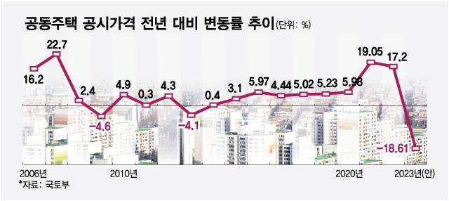 국토교통부는 22일 2023년도 공동주택 공시가격이 전년 대비 18.6% 하락했다고 밝혔다. 지난해 공시가격이 17.20% 상승한 것을 고려하면 올해 공시가격은 사실상 2021년 수준으로 돌아갔다. 약 20년 전 첫 조사·산정을 실시한 이후 가장 큰 하락인 동시에 2014년부터 이어져 온 공시가격 상승세가 10년 만에 하락세로 전환한 것이다.