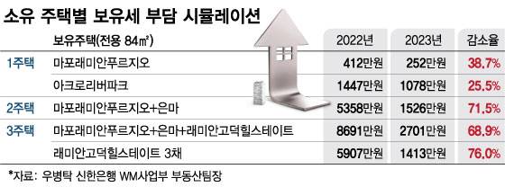 2주택 이상 다주택자의 보유세 부담도 작년 대비 대폭 줄어든다.'마포래미안푸르지오' 전용 84㎡와 '은마' 전용 84㎡(공시가격 15억4400만원)를 소유한 2주택자에게 부과되는 보유세는 1526만원이다.