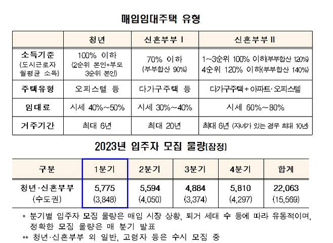국토교통부는 16개 시·도에서 '2023년도 청년·신혼부부 매입임대주택' 1차 입주자 모집을 시작한다고 밝혔다. 청년·신혼부부 입주자 모집은 매 분기마다 실시한다. 청년·신혼부부 외 일반 입주자 등은 수시로 모집한다.