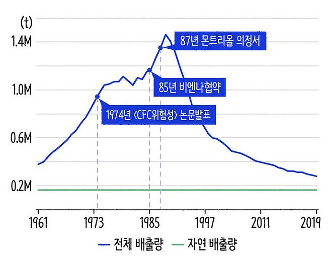 그러다가 1974년, 오늘 편지 도입부에서 이야기했던 마리오 몰리나가 동료 셔우드 롤랜드와 함께 논문을 하나 내게 됩니다. 이 논문에는 CFC가 오존층을 파괴한다는 내용이 담겨있었습니다. 하지만 그럼에도 불구하고 사람들은 바뀌지 않았어요. 스웨덴이 전 세계 최초로 1978년에 CFC가 들어있는 에어로졸 스프레이 사용을 금지했을 뿐이지 미국이나 다른 유럽 국가에선 꾸준히 CFC를 사용했습니다. 한 번 아래 그래프를 봐 볼까요?