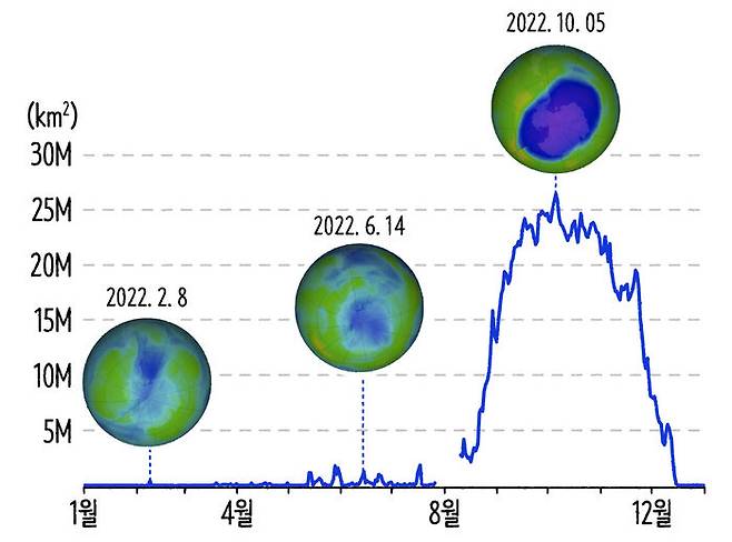 그 오존층에 구멍이 뚫려있다는 이야기, 아마 독자 여러분도 많이 들어봤을 겁니다. 하지만 오존층 구멍이 1년 내내 뻥 뚫려있다고 생각하는 건 오해입니다. 보통 우리가 말하는 '오존층 구멍'은 오존 값이 220DU(Dobson Unit, 오존측정단위) 미만인 지역을 의미해요. 그러니까 농도가 낮아서 얇은 지역을 구멍이라는 표현을 사용하는 거죠. 이 오존 농도는 계절의 영향을 받다 보니 어느 때는 구멍이 사라지고, 또 어느 때는 구멍이 심해지는 일종의 계절성을 갖고 있어요.