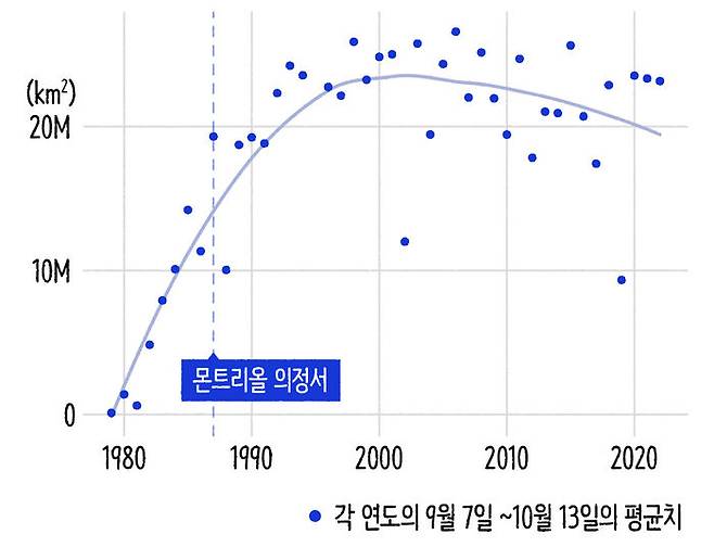 얼마나 회복되고 있는지 데이터로 살펴볼게요. 아래 그래프는 남극의 오존층 구멍이 가장 커지는 9월 7일부터 10월 13일까지의 오존 구멍의 연평균 데이터입니다. NASA의 1979년부터 2022년까지 데이터 가지고 그래프를 그려보면 1987년 몬트리올 의정서가 체결되었음에도 오존층의 구멍은 계속 커졌죠. 가장 구멍이 컸을 때가 2006년인데 그 당시 오존층 구멍의 크기가 무려 2,660만㎢! 우리나라의 면적이 10만 ㎢ 정도니까 우리나라 266개가 들어갈 정도의 규모인 겁니다. 하지만 그 이후로는 오존층 구멍의 크기가 점차 줄어들고 있습니다. 최근 들어서는 완만하지만 감소하는 모습이 보이죠.