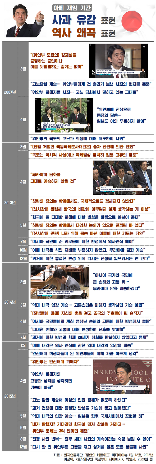 이런 기조는 아베 신조 전 총리 재임 기간 강해졌습니다. 그래도 고이즈미 전 총리는 2001년 서대문 형무소를 찾아 순국한 독립운동가를 향해 참배하고, 무라야마 담화를 계승하겠다는 걸 공식화했지만, 아베 전 총리는 그간 일본의 사과를 부정하는 역사 왜곡 발언을 자주 이어갔습니다. 한국 언론은 이를 '망언'이라고 불렀습니다.