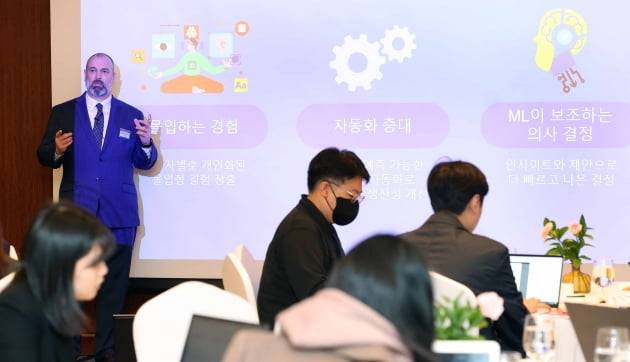 데미안 리치 워크데이 APJ CTO가 23일 강남 그랜드 인터컨티넨탈 서울파르나스 호텔에서 열린 기자간담회에서 'AI/머신런닝을 통해 진화하는 미래의 업무 환경'에 대해 발표하고 있다.
