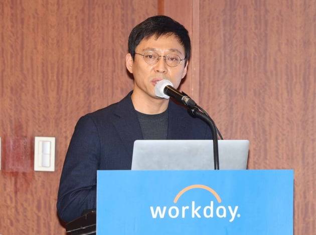 이상훈 워크데이코리아 지사장이 23일 강남 그랜드 인터컨티넨탈 서울파르나스 호텔에서 열린 데미안 리치 워크데이 APJ CTO 방한 기자간담회에서 인사말을 하고 있다.