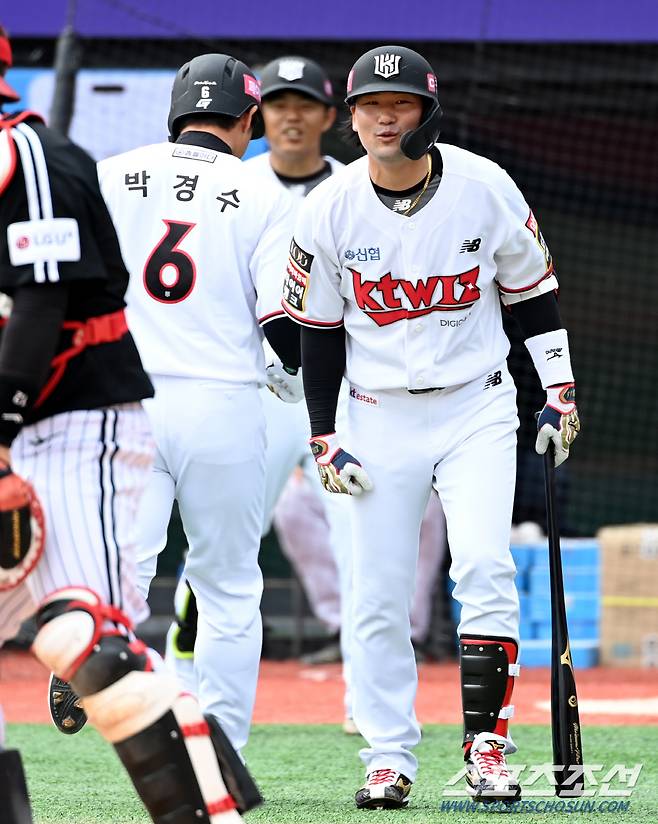 2023 KBO리그 시범경기 LG 트윈스와 KT 위즈의 경기가 23일 수원KT위즈파크에서 열렸다. 3회말 KT 박경수가 동점 솔로홈런을 치고 김상수와 기쁨을 나누고 있다. 수원=허상욱 기자wook@sportschosun.com/2023.03.23/