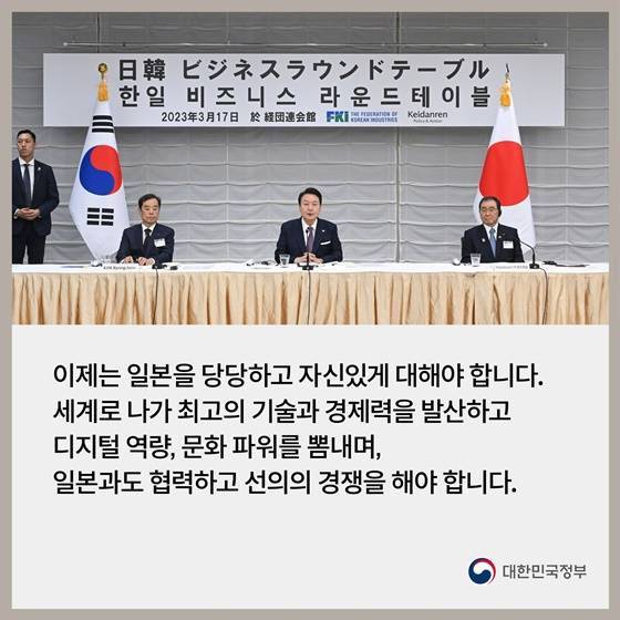 세계로 나가 최고의 기술과 경제력을 발산하고 디지털 역량, 문화 파워를 뽐내며, 일본과도 협력하고 선의의 경쟁을 해야 합니다.